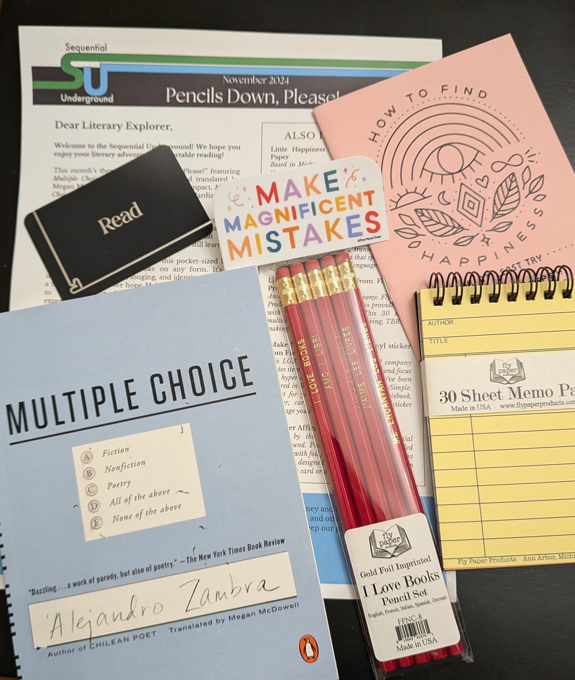 November's theme was “Pencils Down, Please!” featuring Multiple Choice by Alejandro Zambra and translated by Megan McDowell. A little book with a big impact, Multiple Choice is written in the form of a standardized test, offering a new kind of reading experience.